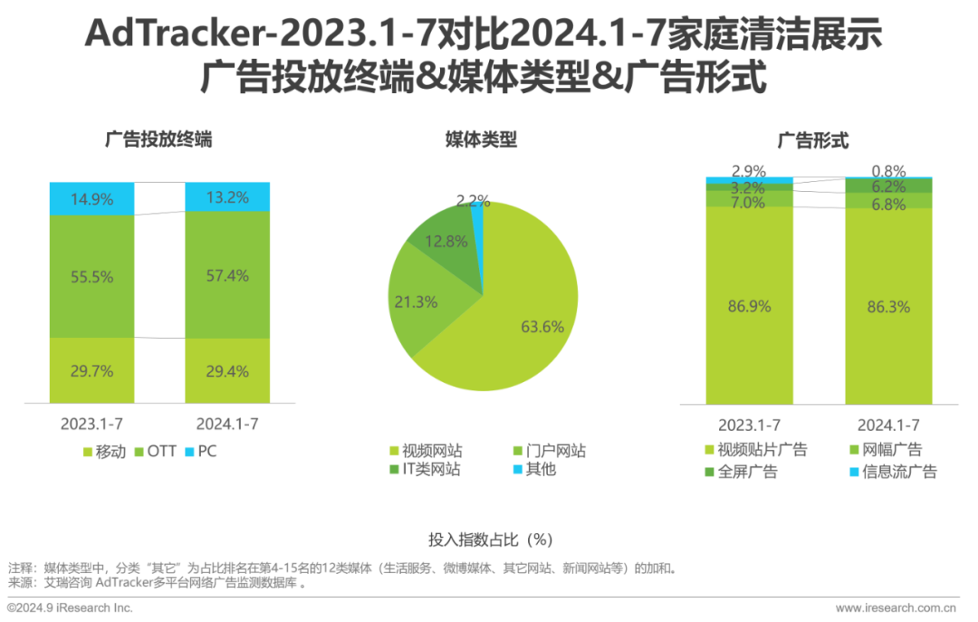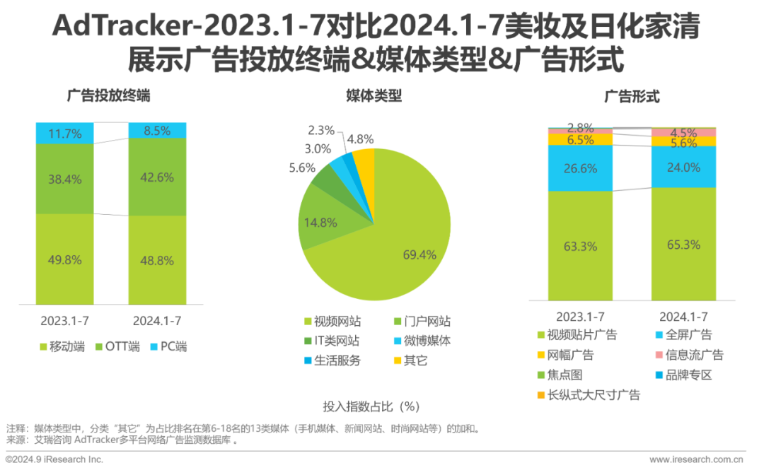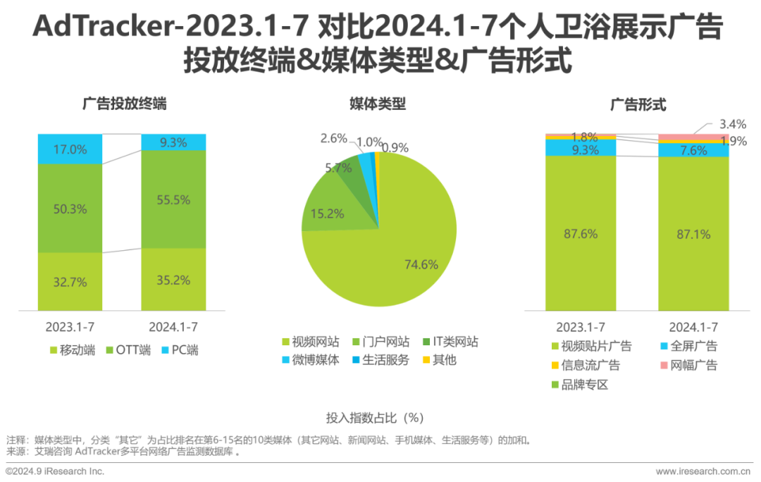 行业广告投入青睐促销节点,上半年个人卫浴投放势头强劲,打破美妆护肤惯常的领先地位。视频网站和视频贴片广告是行业主流的投放媒体与广告形式;OTT端挤占PC端投入份额,占比增至42.6%,成为仅次于移动端的投放终端。