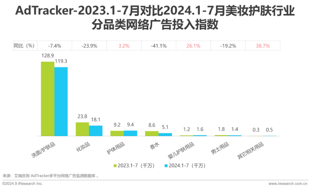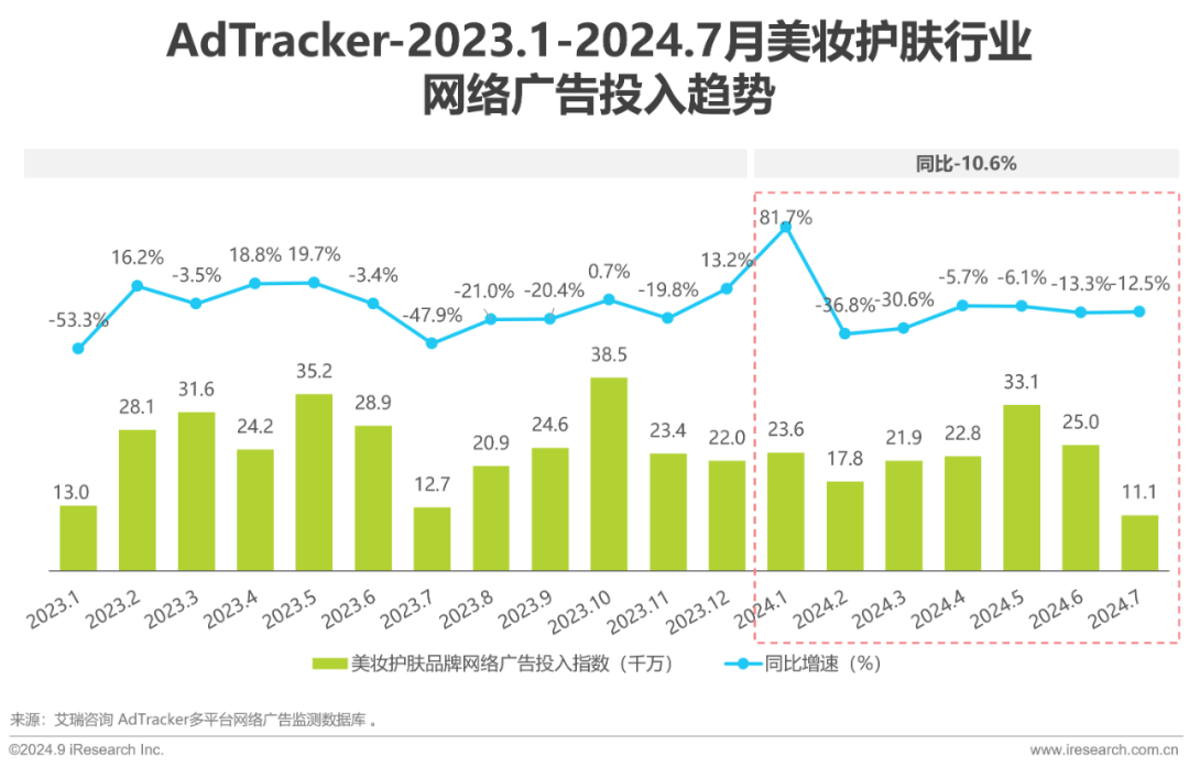 2024年1-7月美妆护肤网络广告投入缩减,同比-10.6%