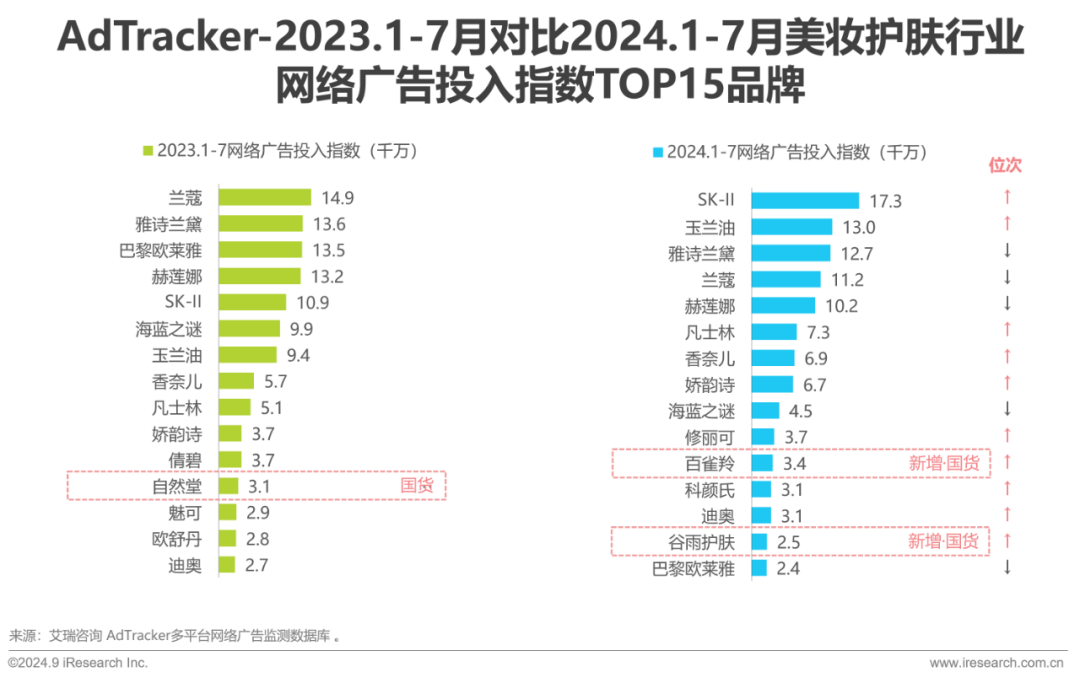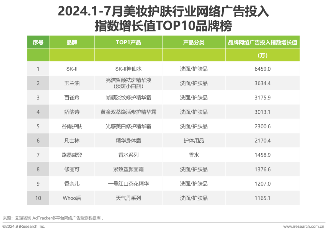 2024年1-7月美妆护肤细分行业品牌网络广告投入增长榜