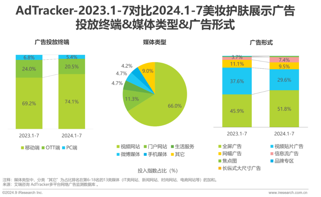 美妆护肤品牌广告主缩减对OTT端和PC端的投入,加大对移动端的投放,将其增至总体份额的74.1%;视频网站仍是美妆护肤广告主的首选,投入指数占比达66.0%;视频贴片广告占比缩减,全屏广告的领先优势进一步增强,占比高达51.8%。