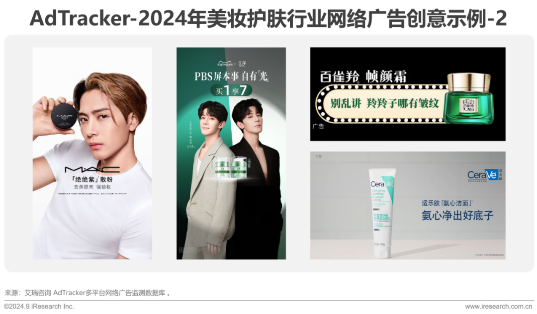 全部七个细分产品品类中,仅三类产品的网络广告投放同比正增长,投入指数占美妆护肤行业超七成的TOP1品类——洗面/护肤品与2023年同期相比,降幅达7.4%;香水品类降幅明显,香水2024年1-7月投入指数为4.7千万,降幅达41.1%。