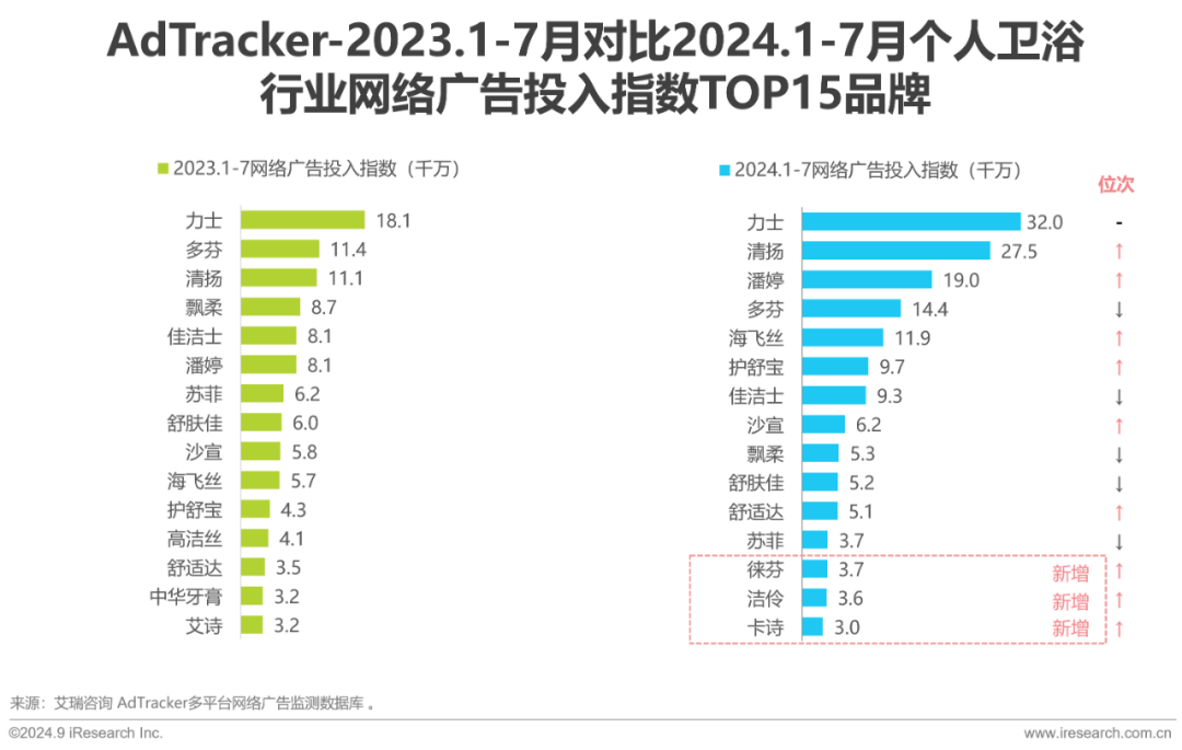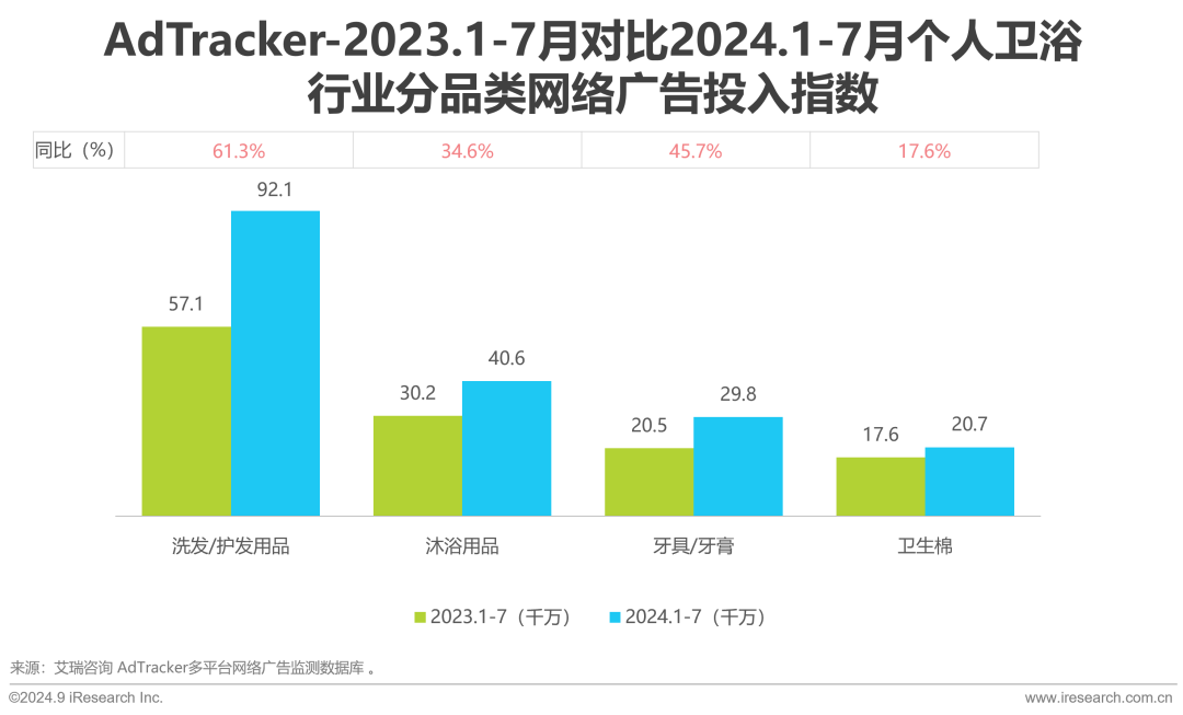 全部四个细分产品品类中,洗发/护发用品、沐浴用品、牙具牙膏和卫生棉网络广告投入正增长,洗发/护发用品同比增长61.3%,市场活力充足。