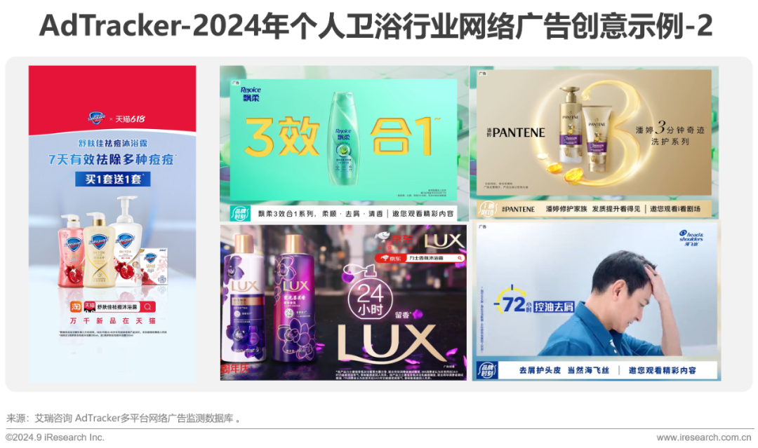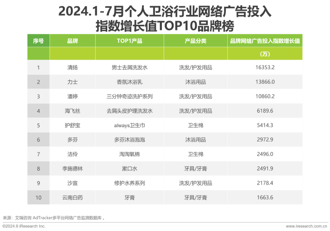 细分品类广告投入大幅增长,其中洗发/护发用品增长最为显著