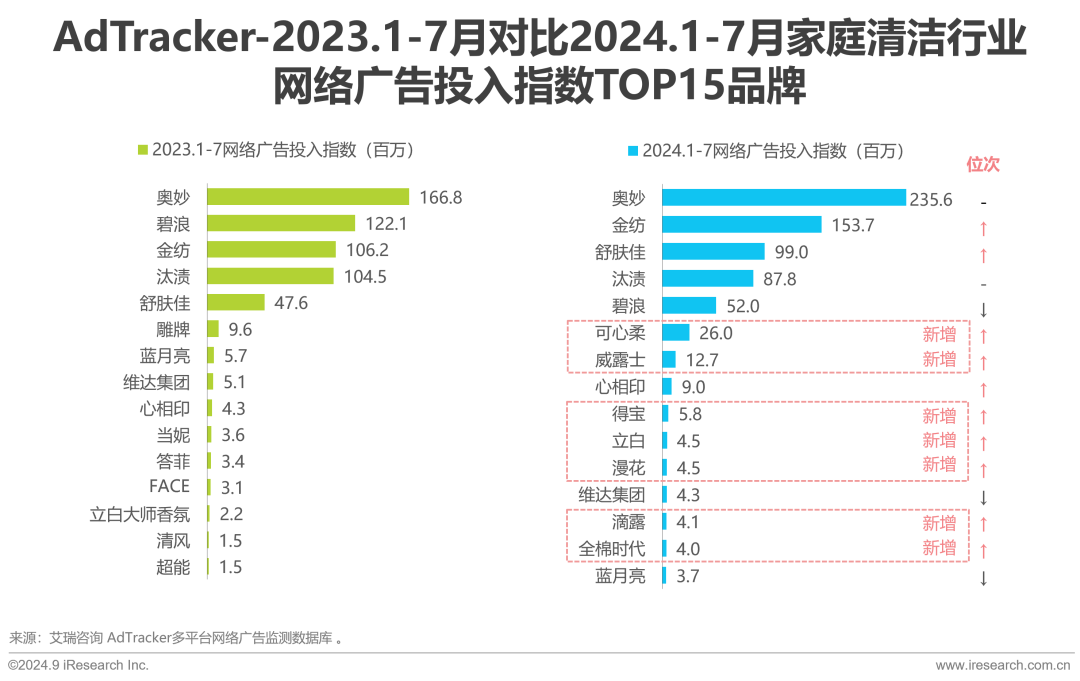 2024年,家庭清洁类TOP15品牌广告投放有所提升,1-7月投放指数之和为706.9百万,同比2023年增加20.4%。广告投入指数排名中,奥妙跟上投放涨势,加大投入稳坐榜单第一,TOP15中后位次多为新品牌,可心柔、威露士等跃进榜单,彰显充足市场活力。