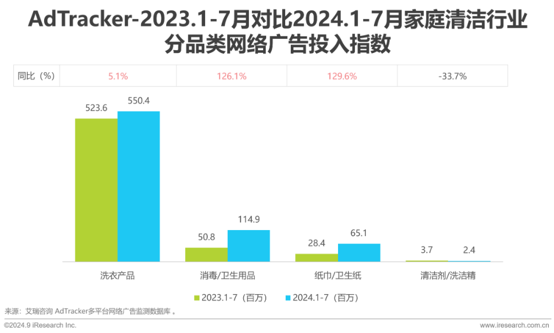 家庭清洁全品类2024年1-7月投入指数为732.9百万,同比增长20.9%。四大细分品类中,洗衣产品是优势品类且保持稳步增长,消毒/卫生用品和纸巾/卫生纸品类广告投放有大幅增长,同比增长分别为126.1%和129.6%。