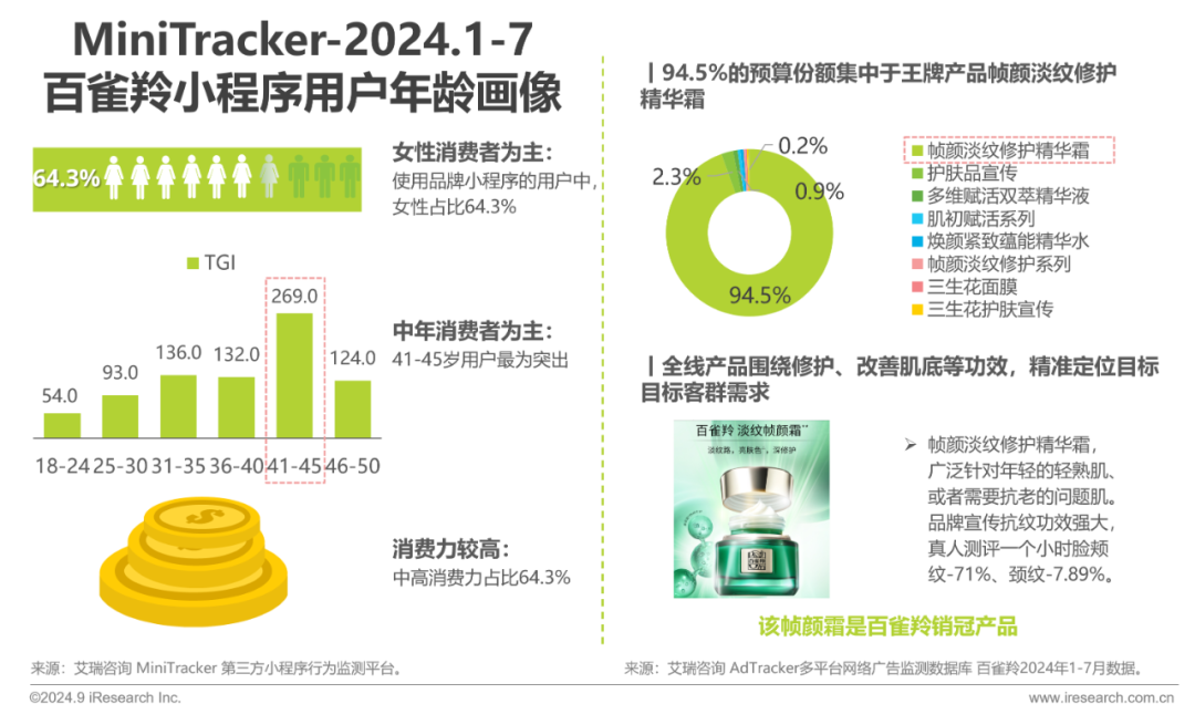 百雀羚的消费者年龄和主要用户为中年女性,消费能力较强。通过精准定位,将大部分营销预算投入到核心产品“帧颜淡纹修护精华霜”,并取得了显著的市场反馈,使该产品成为销售主力,进一步巩固了品牌在目标市场的影响力。
