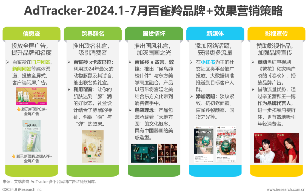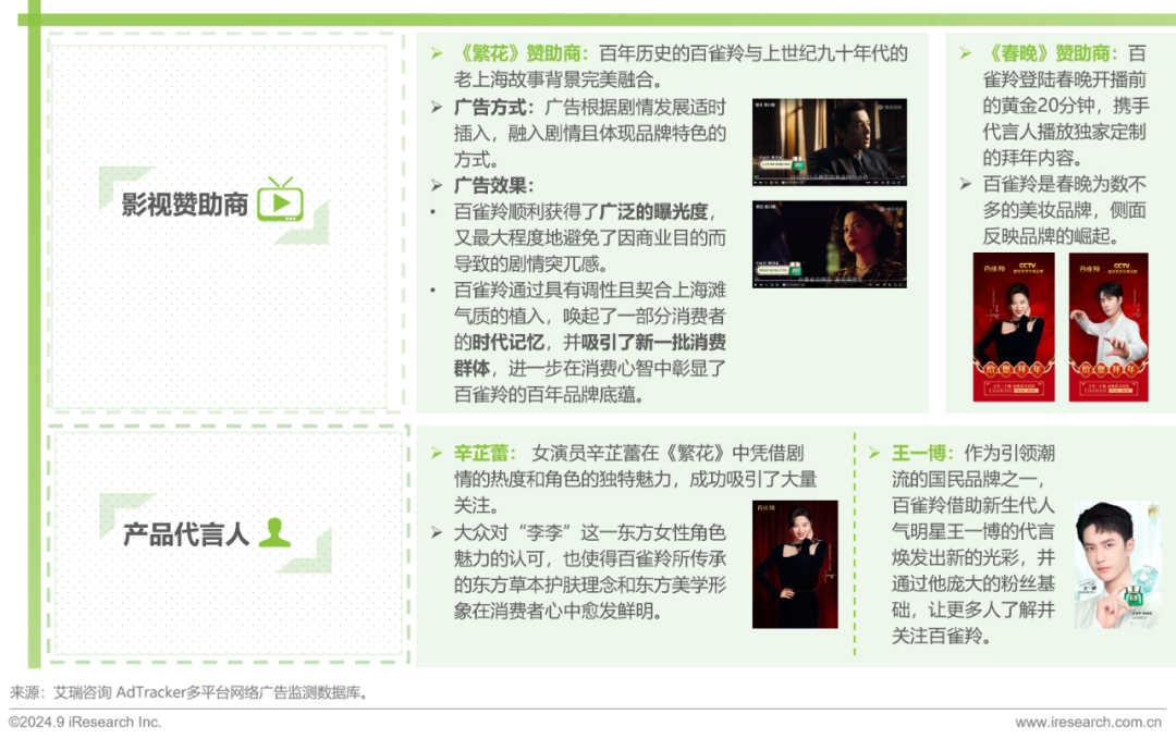 百雀羚成功抓住高点流量成为当红电视剧《繁花》和《春晚》赞助商,加速转化