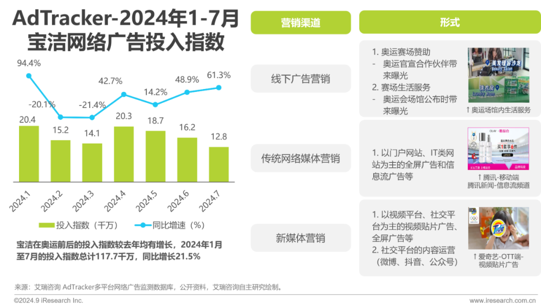 宝洁2024年1-7月的网络广告投入指数同比上涨21.5% ,上涨动力与2024年巴黎奥运会密切相关。宝洁连续12年成为奥运合作伙伴,赛场内以其庞大日化产品线为奥运提供日化产品及生活场馆服务获取官方曝光,赛场外宝洁营销与体育强绑定,开展多元营销活动,增强用户心智,塑造行业内权威地位。