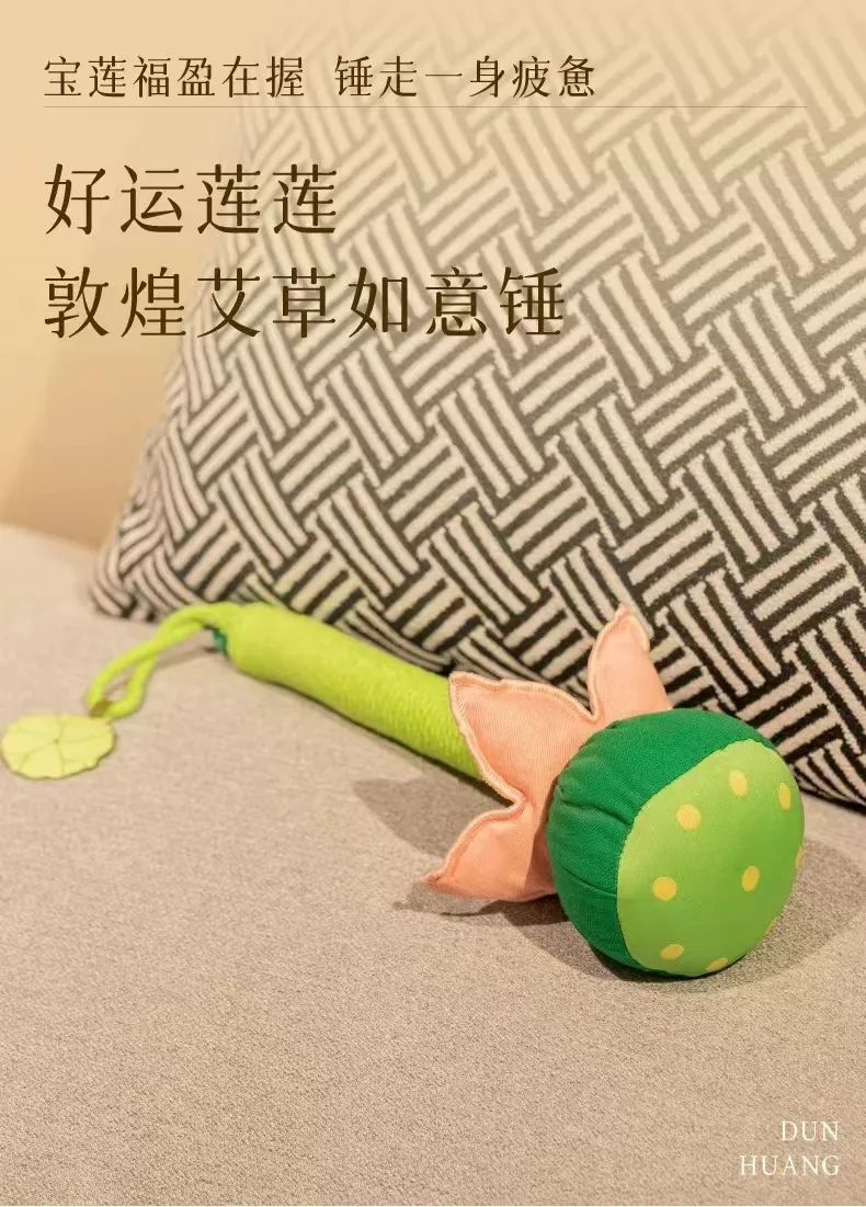 苏州博物馆根据清代名片袋上寓意金榜题名的螃蟹推出了“蟹黄黄”玩偶;故宫博物院依据帝后婚礼之物、点翠凤冠、如意等馆内文物的纹样、造型,设计出四款婚庆红包;敦煌博物馆线上店铺销量过万的“好运莲莲艾草锤”,设计灵感来自敦煌壁画中菩萨所持宝莲。这些文创没有古朴的文物造型,却也是文物及背后文化要素的体现,经由现代设计和审美打磨,最终成品兼具艺术性和实用性。