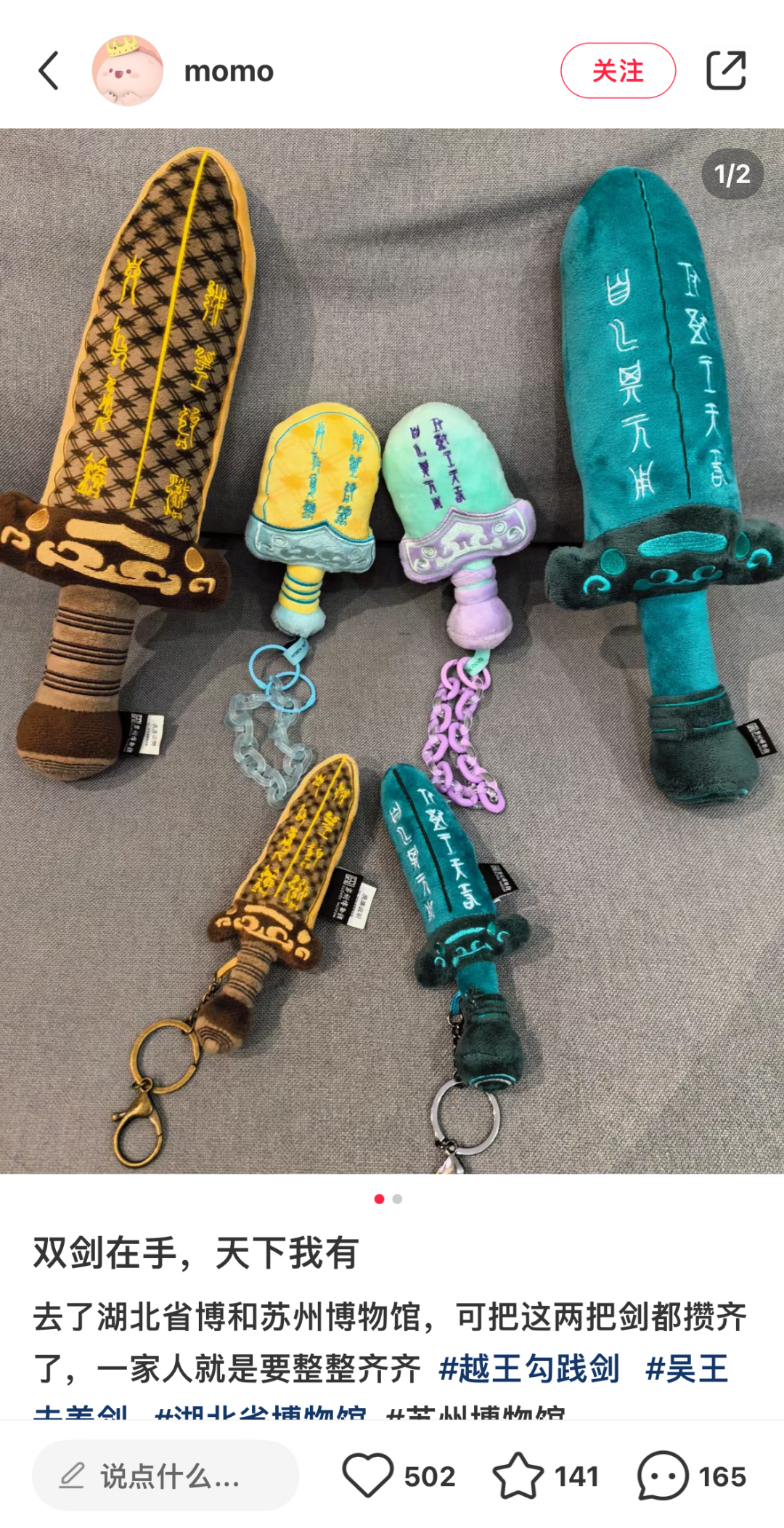 苏州博物馆的吴王夫差剑与湖北博物馆的越王勾践剑向来是历史爱好者间有名的“CP”。苏博在为吴王夫差剑设计文创产品时,也没忘联动湖北博物馆带上越王勾践剑。两把历史名剑,文创产品却是短短胖胖、手感软乎的毛绒玩偶,如此反差形成的萌感和趣味轻松戳中年轻消费者喜好。