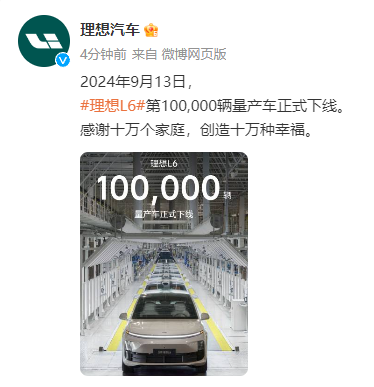 理想汽车微博9月13日消息,9月13日, 理想L6第10万辆量产车正式下线。