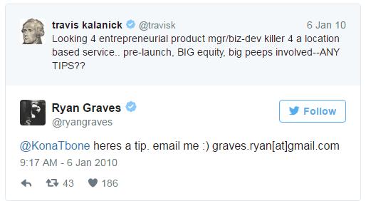 2010年1月:卡兰尼克发布推文,“为一款基于位置的服务寻找创业产品经理/商业拓展杀手——预发布阶段,大股权,涉及范围广——有推荐吗??”Ryan Graves回应了他,不久被任命为CEO 。