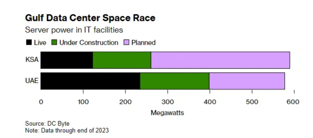 在数据中心的建设方面,中东地区还是落后于欧洲的。根据研究公司DC Byte的数据,截至2023年底,阿联酋的数据中心容量为235兆瓦,沙特为123兆瓦,而德国则高达1060兆瓦。