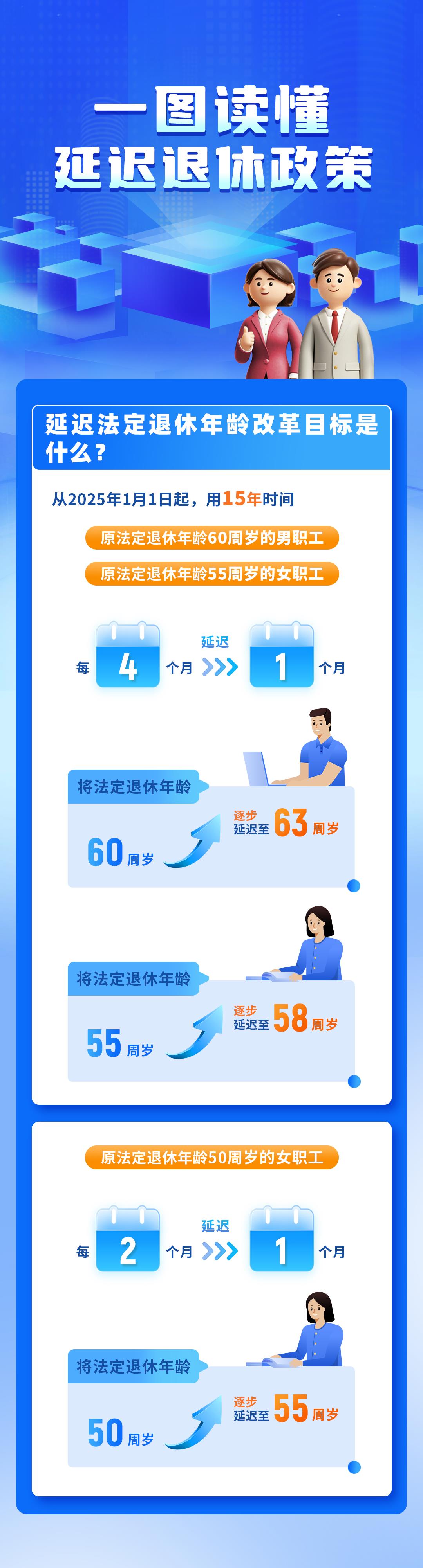 第十四届全国人民代表大会常务委员会第十一次会议通过了《关于实施渐进式延迟法定退休年龄的决定》,本决定自2025年1月1日起施行。男、女职工的法定退休年龄怎样调整?哪些渠道可以查询本人对应的法定退休年龄?弹性延迟退休是怎么规定的?一组图读懂: