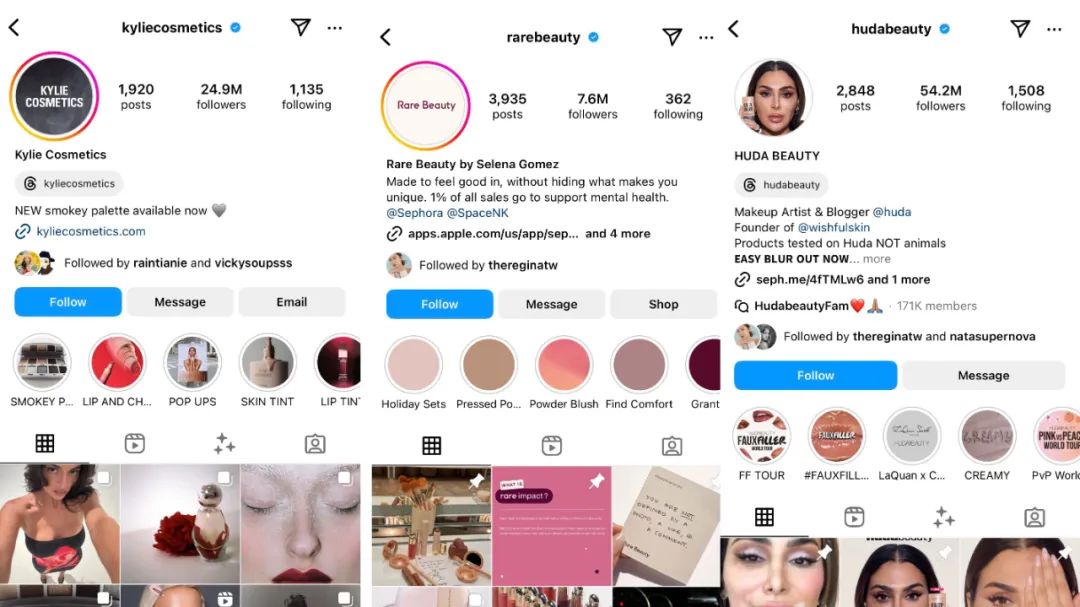 目前,Huda Beauty在Instagram累计粉丝数达5420w,已超Rare Beauty(760w)和Kylie Cosmetics(2490w)的粉丝数之和。