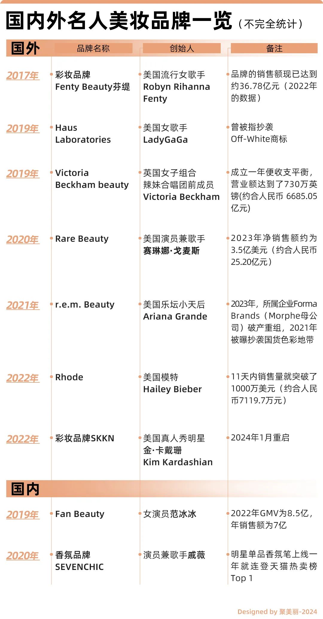 还有琳娜·戈麦斯成立于2020年的个人美妆品牌Rare Beauty,2023年净销售额约为 3.5 亿美元(约合人民币25.20亿元)。