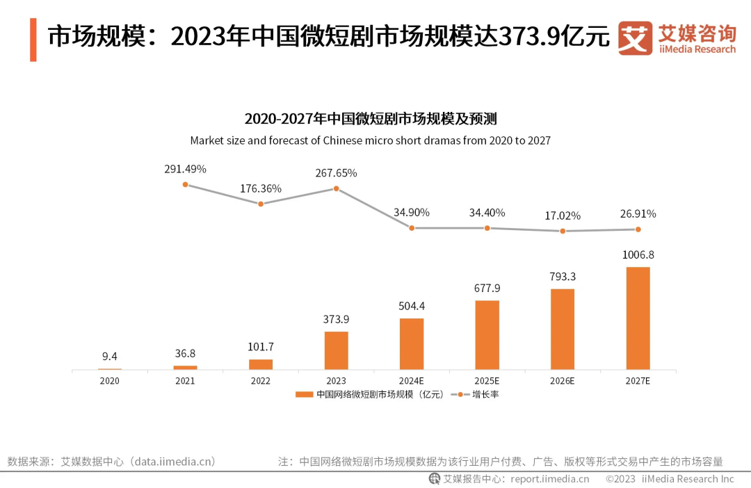 《中国网络视听发展研究报告(2024)》数据显示,截至2023年12月,我国网络视听用户规模达10.74亿,而据艾媒咨询发布的《2023—2024年中国微短剧市场研究报告》显示,2023年我国微短剧市场规模为373.9亿元,同比增长267.65%。预计到2027年,我国微短剧市场规模将超1000亿元。2024年上半年抖音、快手两大平台实际播出微短剧381部,同比增长9.2%。近八成微短剧播放量达到千万以上,有4部累计播放量超过10亿。