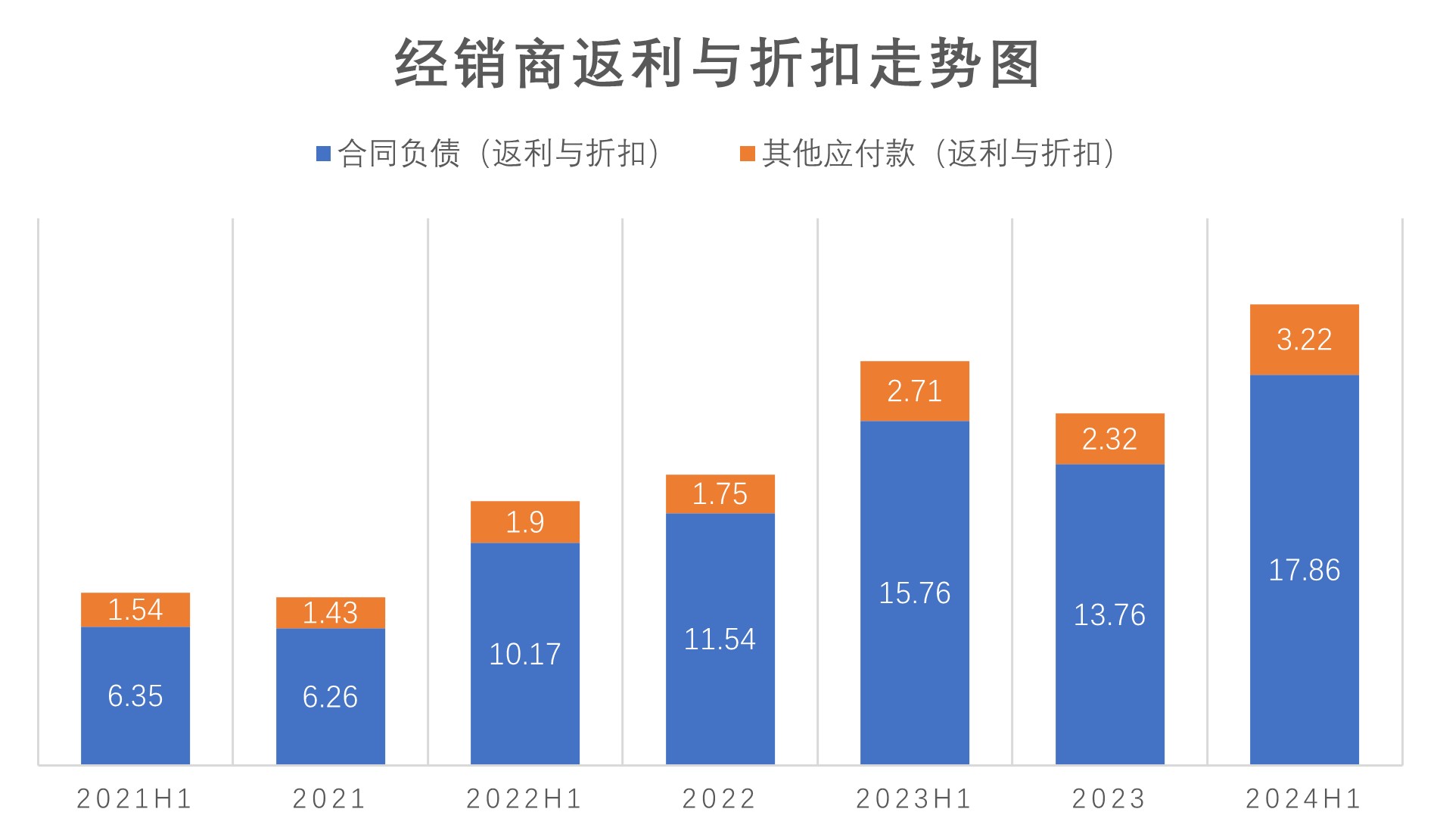 另外,从经销商折扣数据可以印证东鹏饮料目前业绩增长质量。合同负债中的另一项和其他应付款中都包含应付销售返利与折扣款。将这两项合计来看,上半年该数据为21.08亿元,去年同期为18.48亿元,同比增长14.1%,相比过去两年呈放缓趋势。返利折扣占当年销售额的比例,2022年是高峰,此后逐渐降低,今年中报的数据在26%左右,这一比例远高于同行。高折扣意味着即使经销商渠道动销不畅也能通过增加订货量来获得返利。东鹏饮料给予经销商较高折扣或是其能保持强势增长的原因之一,目前为止收到的效果仍然较好。