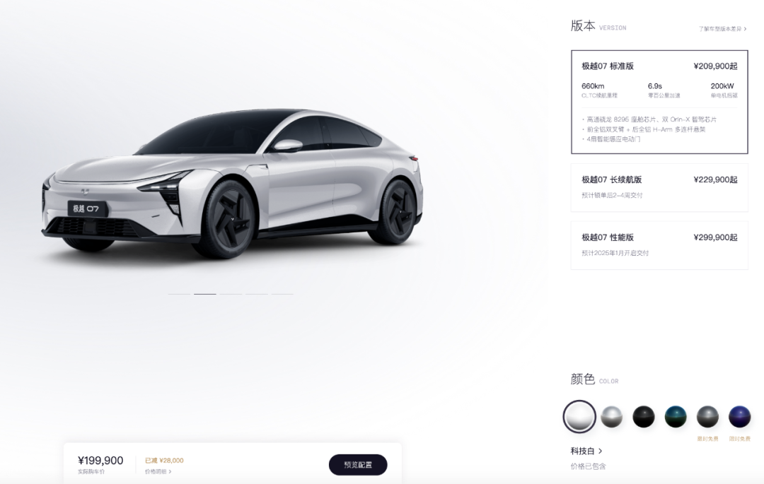首次亮相4个多月后,极越07终于正式发布,推出标准版、长续航版、性能版3款配置车型,包括6种配色,限时优惠下价格区间为19.99万元~28.99万元。