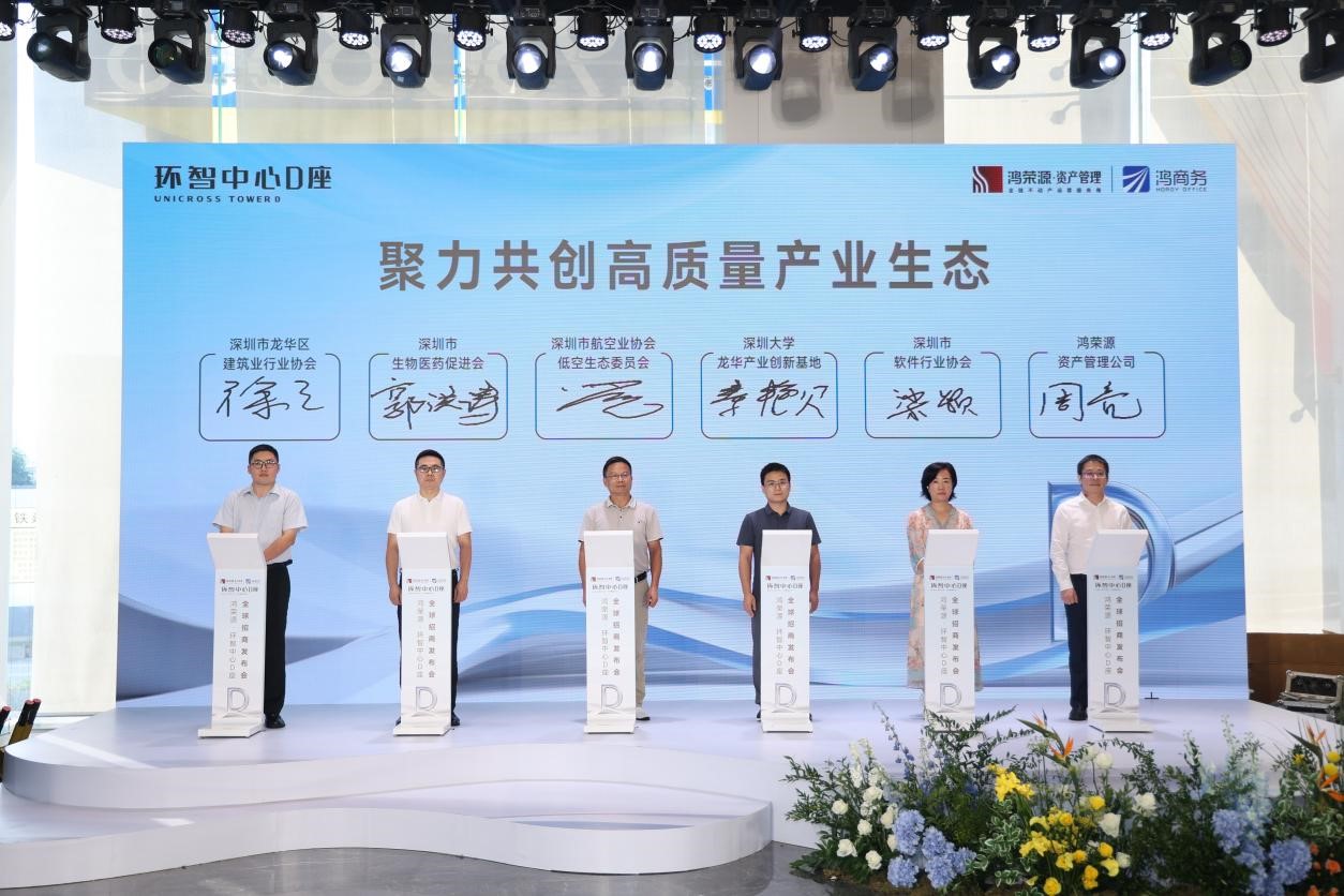 为充分链接企业与政府、市场,共同探索城市产业发展新路径,深圳大学龙华产业创新基地、深圳市软件行业协会、深圳市航空业协会低空生态委员会、深圳市生物医药促进会、深圳市龙华区建筑业行业协会与鸿荣源资产管理公司达成战略合作。以资源共享、合作共赢的新态势为区域招商引资带来全新发展机遇。最后,在各界领导嘉宾的共同见证下,环智中心D座全球招商正式启幕。