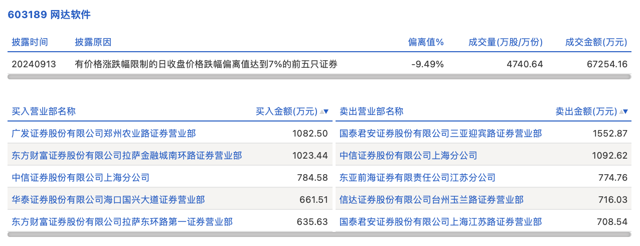 9月13日,网达软件今日跌停,龙虎榜数据显示,上榜营业部席位全天成交9032.48万元,占当日总成交金额比例为13.43%。其中,买入金额为4187.66万元,卖出金额为4844.82万元,合计净卖出657.17万元。