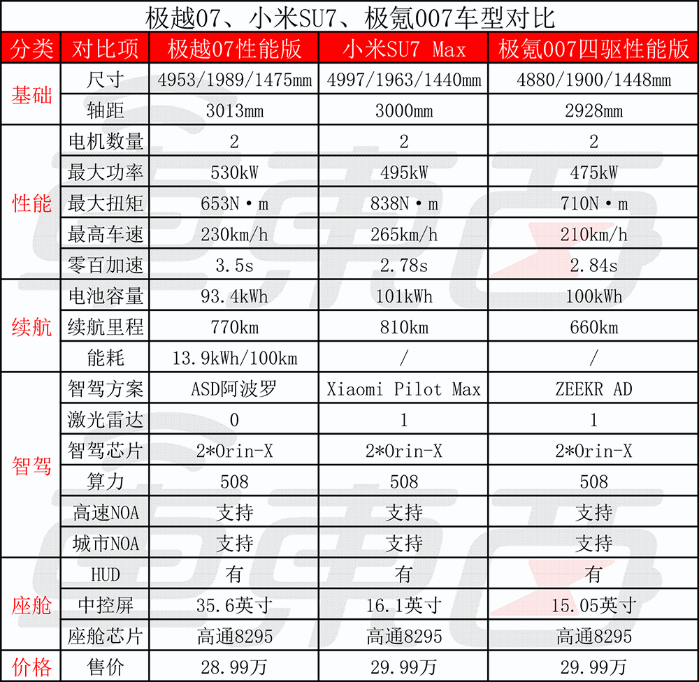 ▲极越07性能版和小米SU7 Max、极氪007四驱性能版对比