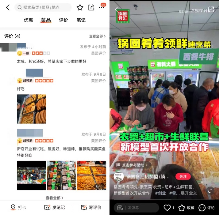 目前为止,包括大众点评与小红书等公开网络平台上,关于“锅圈肴肴领鲜”的来自消费者的评价寥寥无几——这似乎也合乎情理,与在社交平台上具有强曝光的消费品牌店相比,一间开在农贸市场的店及其消费群体,有着不同的调性。较为明显的一个对比是,小红书上一位网友发布的一家锅圈肴肴领鲜门店视频显示,聚集在其门口的消费者中,并不少见老年人。