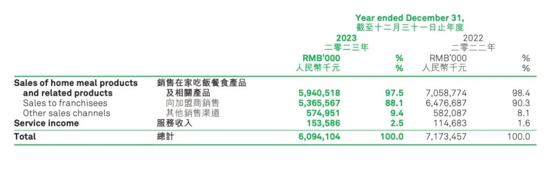 其中,营收下滑主要是因为锅圈在家用餐食品及相关产品收入减少,而这是锅圈业绩中占比达97.5%的业务。财报显示,该项收入从2022年的70.588亿元减少约15.8%至去年的59.405亿元。财报中唯一增长的是服务收入,在去年增加约33.9%,主要由加盟门店数量增长所带动。