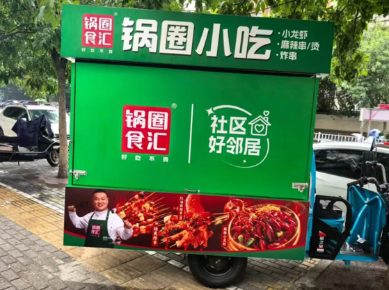 8月,锅圈在公众号宣布它的10万辆小吃车正陆续上市,一站式售卖“小龙虾、麻辣烫、炸串”等速食,其董事长杨明超宣布,这些车将全国免费铺3年。而这些车将成为门店延展销售的利器,1店配10车,甚至会出现在夜市上,开辟室外用餐面积,增加门店的销售额。