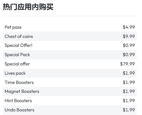 Data.ai数据显示,Pokipet的内购项目均为单项付费,包含宠物通行证、金币、游戏助力器等等。类别多元但价格相对便宜,很多项目仅售价1.99美元。