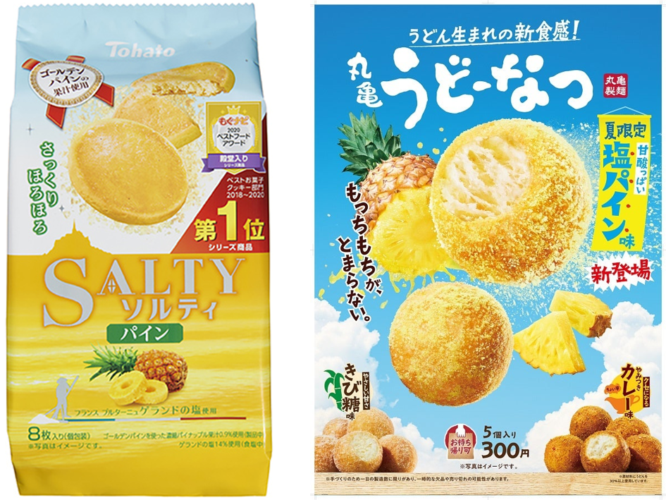 除了柠檬,菠萝也是夏日常见的水果口味。今年,日本市场也出现了不少菠萝x海盐的风味搭配,桃哈多(東ハト)的咸味饼干系列、丸龟制面的乌冬面丸系列都推出了菠萝海盐风味新品,带来了酸甜菠萝和微妙的咸味的组合。