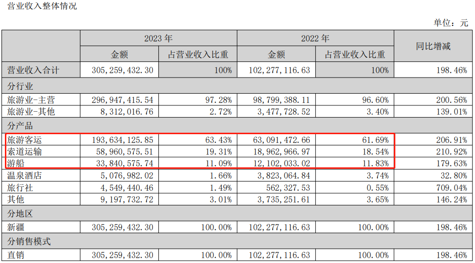 与众多文旅上市企业类似,西域旅游的商业模式为依托优质旅游资源的特许经营权,通过开展交通运输、酒店、旅行社业务来获取收入。目前,西域旅游业务覆盖景区包括天山天池景区、五彩湾古海温泉、火焰山景区,在主营业务上主要以交通运输为主,温泉及酒店、旅行社为辅。根据2023年报,西域旅游的旅游客运、索道运输、游船合计贡献超9成收入。