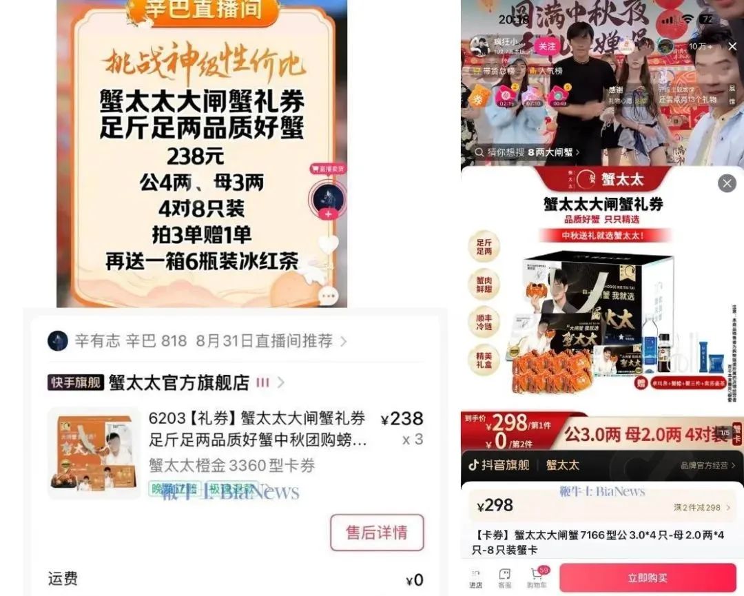 翻看过往,“蟹太太”2021年就已开始与头部主播合作,并在当年创下了2分钟内销售额突破600万元的成绩。今年8月22日,贾乃亮抖音直播间,“蟹太太”溯源专场卖出32万单,卖出大闸蟹280万只,销售额接近9000万。本次与辛巴与小杨哥两大主播的合作,销售量同样可观,其中辛巴销售了七八千万。