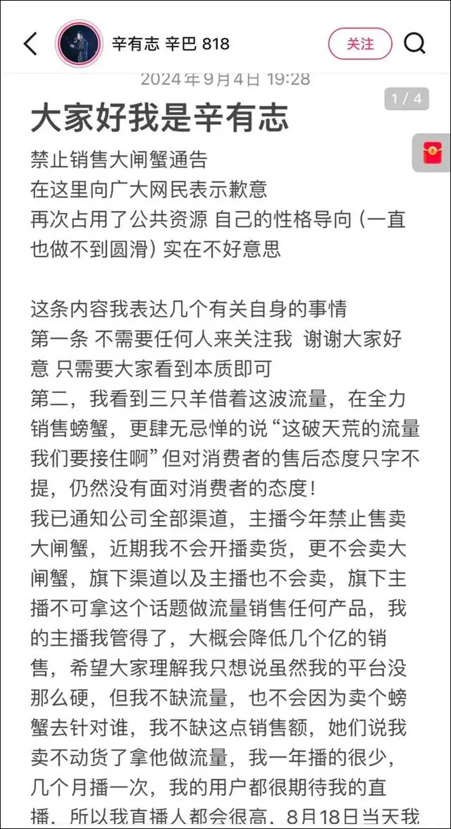 面对三只羊的回应,辛巴表现更为激进,9月4日晚也发文称,“已通知公司全部渠道,主播今年禁止售卖大闸蟹。近期我不会开播卖货,更不会卖大闸蟹,旗下渠道以及主播也不会卖,旗下主播不可拿这个话题做流量销售任何产品。”