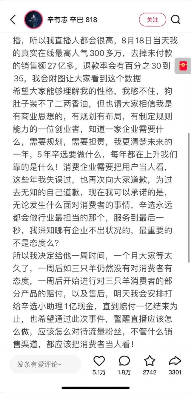 辛巴贵为快手的头部主播,深知流量的重要性,在直播电商领域,流量就是生命线。此前多次因流量问题怒怼过快手的他,这次将目标换成抖音的头部主播,大概率也是想通过与三只羊的冲突吸引公众眼球,制造话题,试图在竞争激烈的市场中抓紧红利期的尾巴,获取一波外部流量,保持自己的地位。