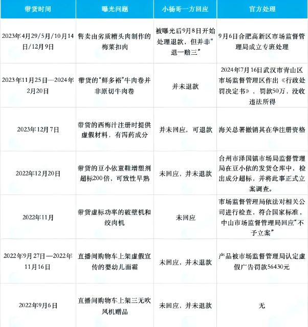除了以上两大翻车史,根据天眼查整理的公开资料显示,近两年小杨哥带货翻车不下5次,多数事件并没有回应,也没有做出相应退款,详情如下图: