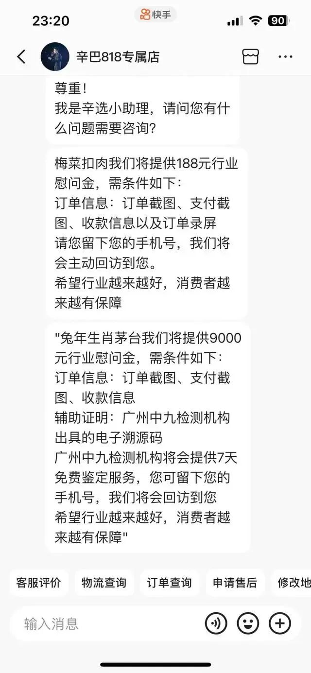 当日晚10点多,有多名网友在辛巴账号最新视频的评论区中发布与辛选客服对话的截图。截图显示,当消费者发送“梅菜扣肉”等关键词后,辛选客服回复将提供“行业慰问金”。