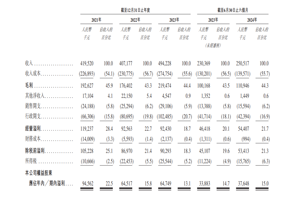 业绩方面,2021年、2022年、2023年及2024年上半年,爱维艾夫营收分别为4.20亿元、4.07亿元、4.94亿元及2.51亿元;毛利分别为1.93亿元、1.76亿元、2.20亿元及1.11亿元,毛利率分别为45.9%、43.3%、44.4%及44.3%;公司股东应占年内溢利分别为9654.2万元、6451.7万元、6479.4万元及3764.8万元,利润率分别为22.5%、15.8%、13.1%及15.0%。