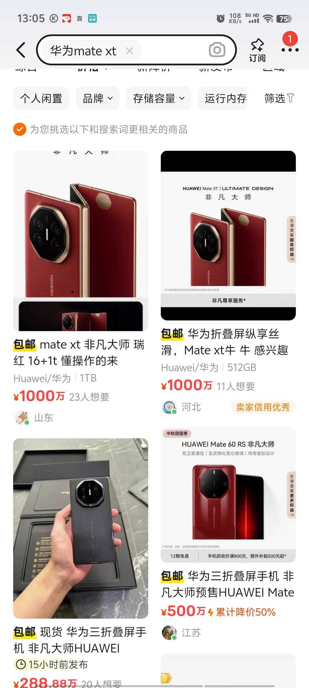 比如一位标价1000万的卖家,其介绍为Mate XT非凡大师瑞红16+1T,懂操作的来。另一位标价500万的卖家,则称付款默认“付款不退不换、本人拿到手后第一时间顺丰寄出、定金不退”等条件。