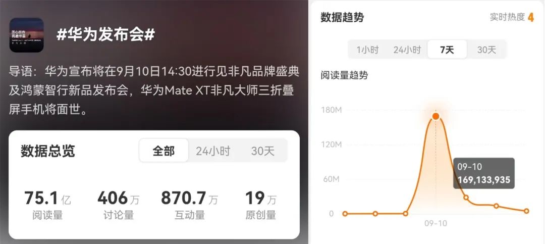 微博热搜数据显示,仅9月10日当天,“华为发布会”话题就获得1.69亿阅读量,三天内共吸引近400家媒体关注,全网阅读量超75亿。“虽然我没有购买力,但给越来越没创新力的手机行业带来了新鲜感。”消费者在评论区留言表示。