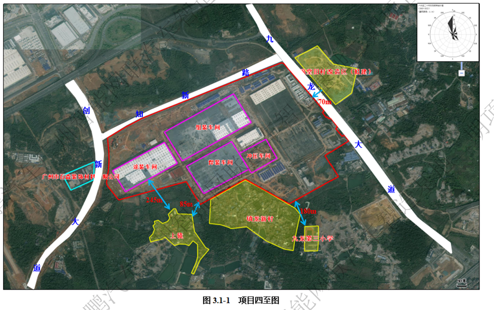 新车建造工厂地址在广州市黄埔区九龙镇广河高速以南、九龙大道以西,工厂用地北面隔知新路为现状林地,西隔创新大道为广州市百森装饰材料有限公司与荒地,南为荒地及镇龙新村,东隔九龙大道为零星厂房与五福堂旧村改造区(拟建)。