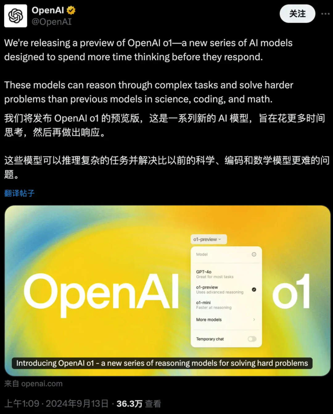 9月13日,Open AI发布了全新一代的大模型预览版,这个在内部代号为“草莓”的模型,在问世的一瞬间,还是激起了业内的震动。