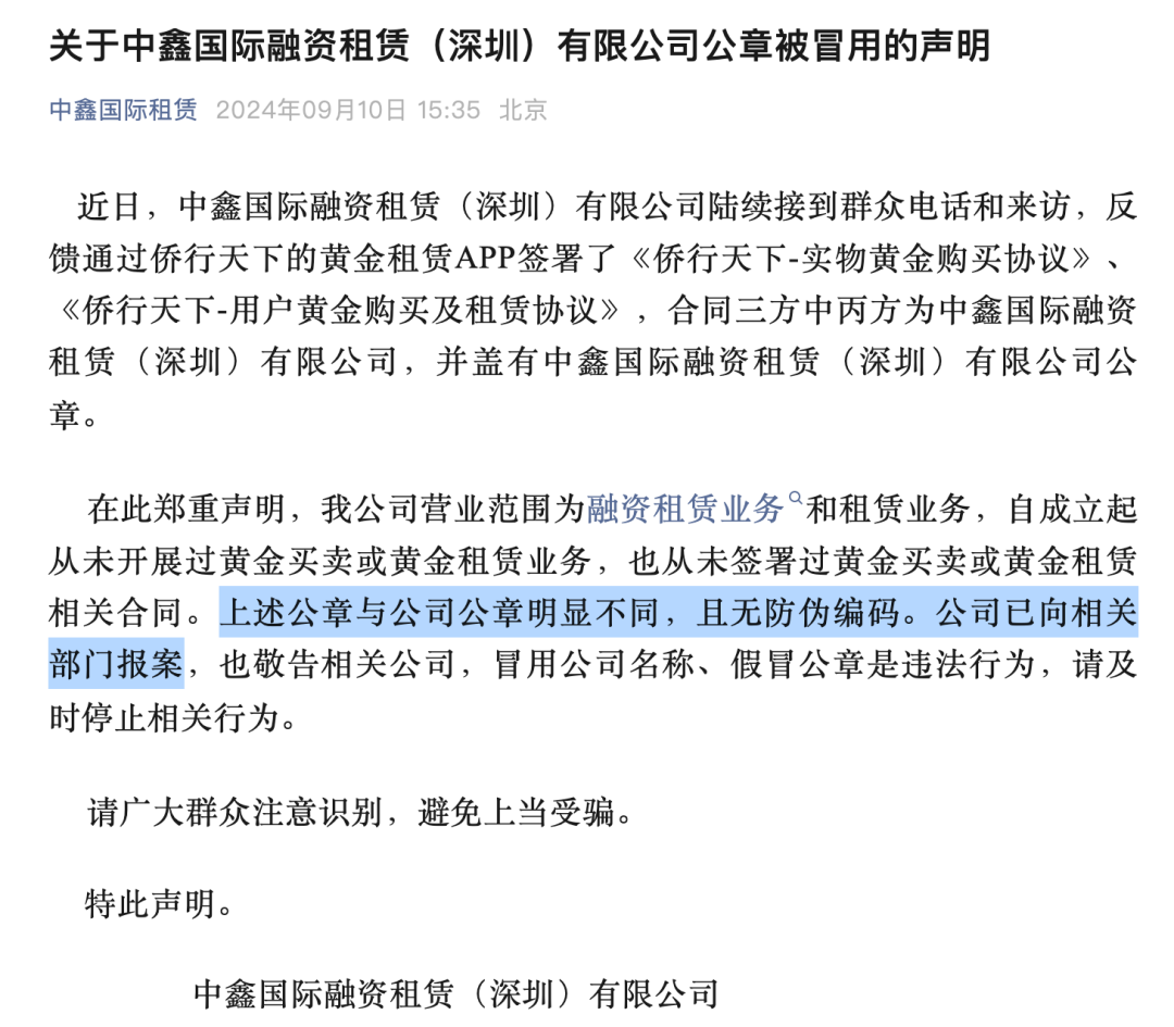 中鑫国际称,“我公司营业范围为融资租赁业务和租赁业务,自成立起从未开展过黄金买卖或黄金租赁业务,也从未签署过黄金买卖或黄金租赁相关合同。上述(侨行天下与投资者签署的黄金购买协议)公章与公司公章明显不同,且无防伪编码。公司已向相关部门报案。”