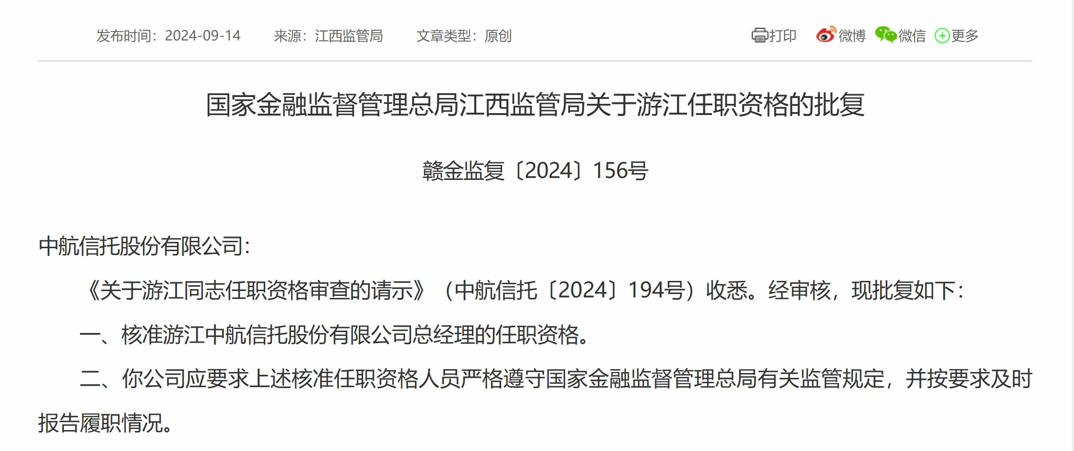 9月14日,国家金融监督管理总局消息,江西监管局核准游江中航信托的总经理任职资格。