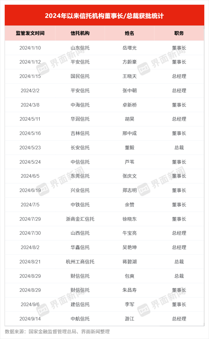 其中,11家机构涉及董事长变动,9家涉及总经理/总裁调整,并且平安信托和财信信托的“一二把手”获批时间均为2024年。