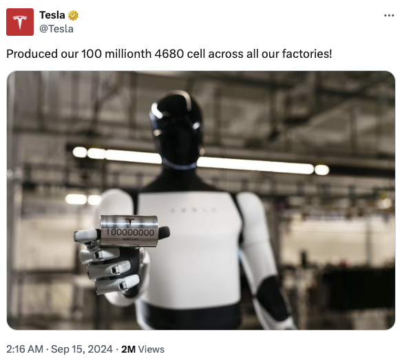 9月15日,特斯拉宣布,其所有工厂4680电池累计产量达到一亿颗。