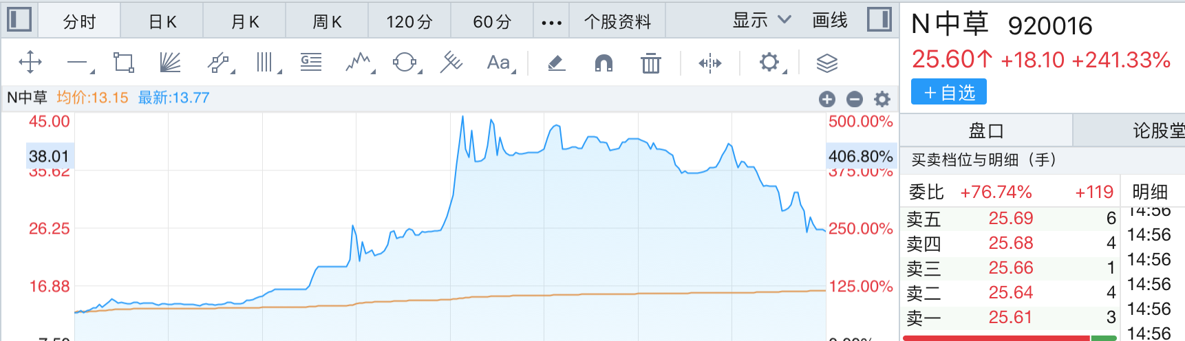 当天,中草香料高开66%,上午10时24分后逐步推高,下午13时左右涨幅一度到了500%,而后逐步回落,最终收盘报25.6元/股,涨241.33%,全天成交额2.47亿元。