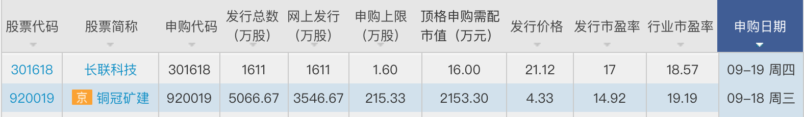 节后首周,虽只有3个交易日,但也有两只新股可供申购,分别为9月18日的铜冠矿建(920019.BJ)和9月19日的长联科技(301618.SZ)。