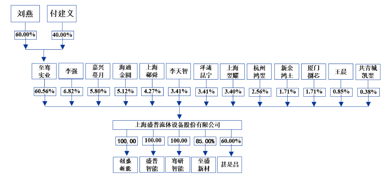 盛普股份控股股东为至骞实业,控制了60.56%的股权。付建义和刘燕夫妇合计100%持有至骞实业,共同为公司实际控制人。