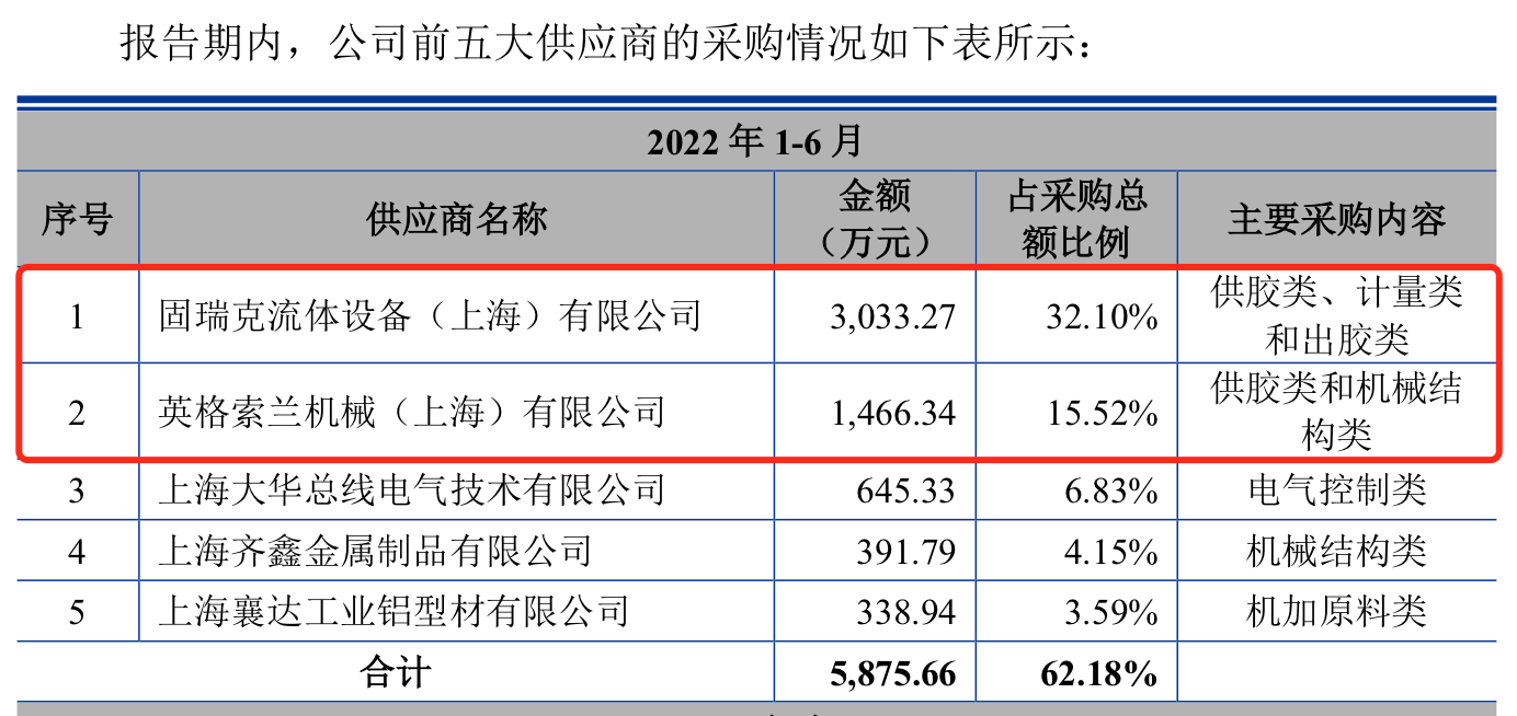 上游方面,盛普股份22年上半年向前五大供应商的采购金额占当期采购总额的比例达6成,尤其是供胶类、计量类和出胶类原材料的供应商较为集中,主要由固瑞克、英格索兰供应。盛普股份向固瑞克、英格索兰合计采购额,占总采购额超47%。